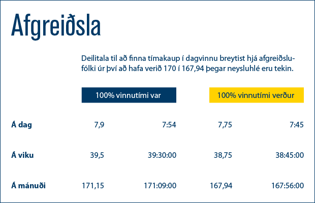 Vinnuskyldutímar á mánuði breytast því hjá skrifstofumanni úr 162 klst. 30 mínútum (162,5) á mánuði í 159 klst og 16 mínútur (159,27) á mánuði. Fyrir þá sem verið hafa með 171 klst. og 9 mínútur (171,15) vinnuskyldu á mánuði þá verður 100% vinna í 167 klst. og 56 mínútur (167,94