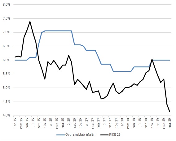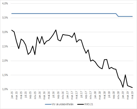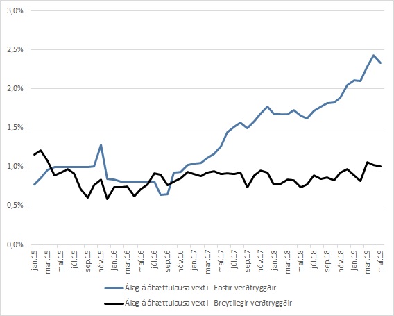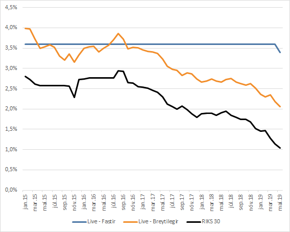 Á myndunum má sjá hvert álagið hefur verið og hvernig það og vextir hafa þróast. Mynd 1 sýnir þróun fastra og breytilegra vaxta á verðtryggðum útlánum Lífeyrissjóðs verzlunarmanna (LIVE) í samanburði við þróun verðtryggðra ríkisskuldabréfa. Mynd 2 sýnir svo hvernig álagið hefur þróast. Hvað föstu vextina varðar hefur álagið meira en tvöfaldast frá upphafi árs 2015, úr 0,8 prósentustigum í 2,3 prósentustig í maí 2019. Álagið hefur hins vegar haldist nokkuð óbreytt fyrir verðtryggð lán með breytilegum vöxtum. Álagið fyrir breytilegu vextina var ákvarðað með ákveðinni reglu sem tryggði sjóðfélögum breytingar á vöxtum í samræmi við þróun markaðsvaxta. Sjóðurinn hefur nú ákveðið að leggja þessa reglu af þannig að óvíst er hvernig þessir vextir þróast í framtíðinni.