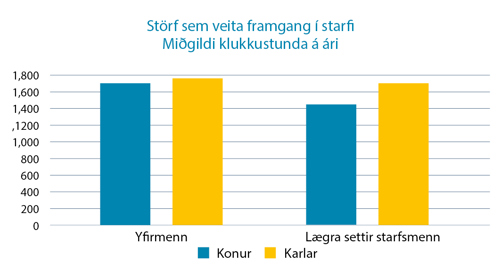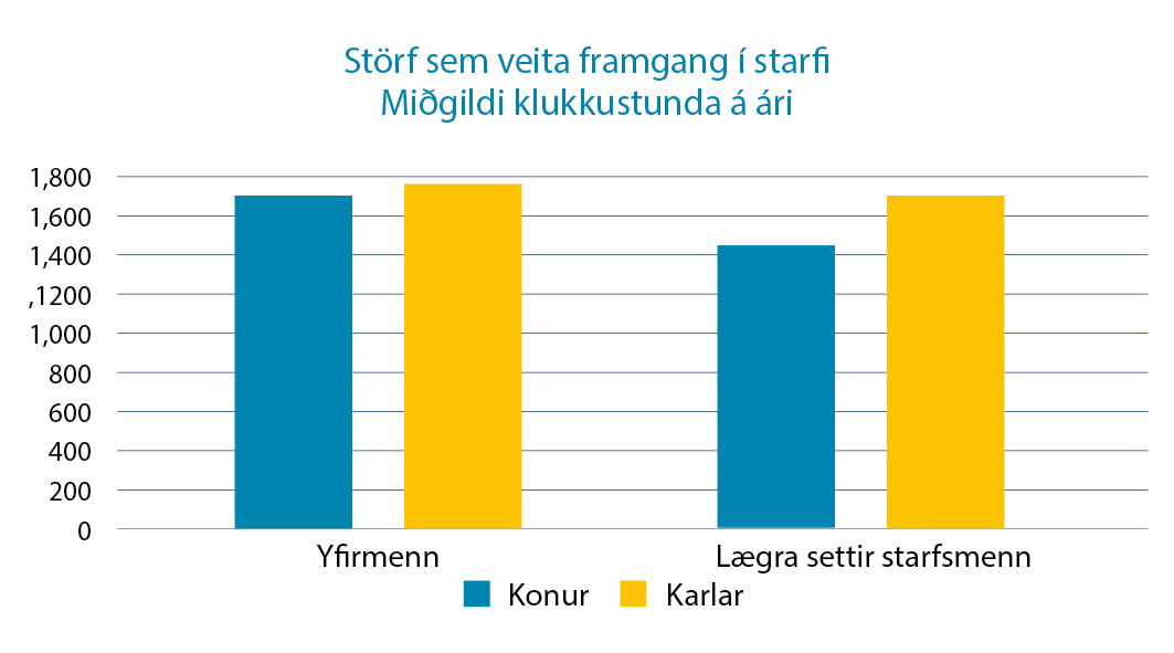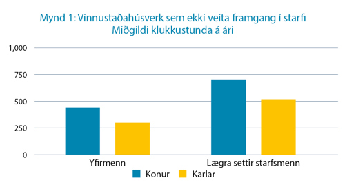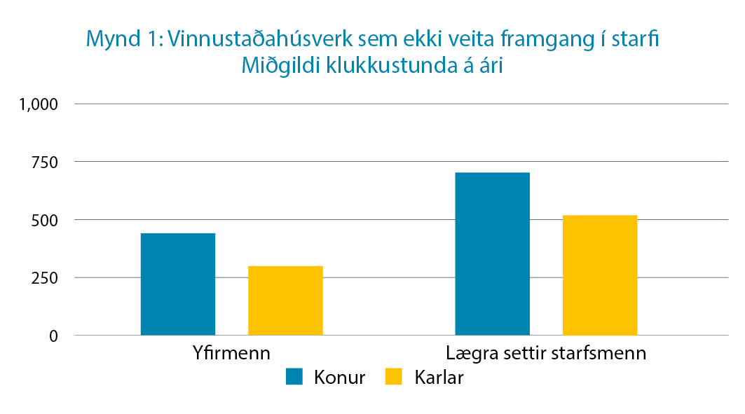 Munur milli kynjanna minnkar aðeins þegar komið er hærra í metorðastiganum. Konur á síðari hluta starfsævinnar (e. senior staff) verja ríflega 400 klukkustundum í verk sem ekki leiða til framgangs á meðan karlar verja rétt tæplega 200 klukkustundum í sambærileg verk. Þegar þetta er tekið saman sést að konur vinna að miðgildi um 200 klukkustundum meira en karlar, sem er um heill mánuður í aukavinnu. Á sama tíma fá þær að sinna um 250 færri klukkustundum á ári, að miðgildi, sem leiða til framgangs í starfi, en karlkyns kollegar með sömu starfstitla, starfsreynslu og menntun meðal þeirra sem eru í sérfræðingsstöðum. Sjá mynd 2. Heilt á litið mun þessi munur segja til sín í líkum á því að ná framgangi í starfi. Samkeppnisstaðan er býsna ólík milli kynjanna þegar kemur að framgangi.