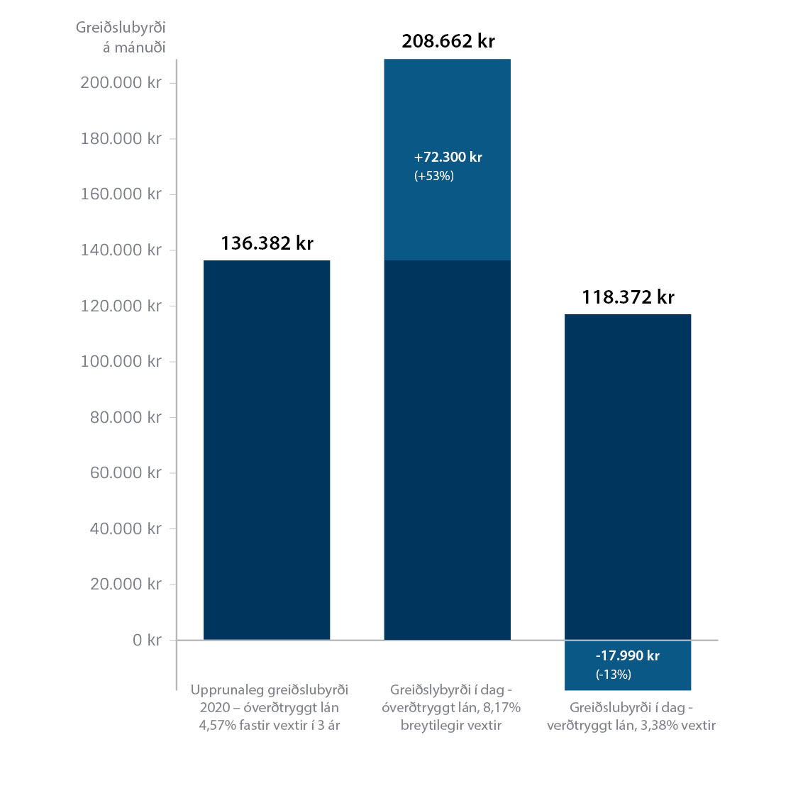 Myndin sýnir hvernig greiðslur á óverðtryggðu 30 m.kr. láni til 40 ára hafa breyst í kjölfar stýrivaxtahækkana, samanborið við verðtryggð lán. Heimili með óverðtryggt húsnæðislán greiddi um 136.000 krónur á mánuði, miðað við vaxtastig um mitt ár 2020. Í dag er fastvaxtatímabilinu hjá fjölskyldunni lokið. Fyrir þessa fjölskyldu er tvennt í boðið annars vegar að færa lánið yfir í óverðtryggt lán á breytilegum vöxtum og myndi greiðslan þá verða 208.000 krónur á mánuði, sem hækkar greiðslubyrðina um 72.000 krónur á mánuði eða um 53%. Hins vegar gæti fjölskyldan skipt yfir í verðtryggt lán og lækkað mánaðarlega greiðslubyrði um 18.000 krónur á mánuði.