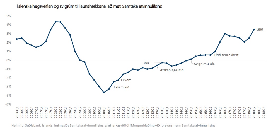 Í samningaviðræðum um kjarasamninga er iðulega rætt um svigrúm til launahækkana. Hversu mikið það er og hvernig það hefur þróast. Svigrúm fer eftir stöðu efnahags- og atvinnulífs hverju sinni og er óhætt að segja að launafólk og atvinnurekendur líti það ólíkum augum. Það virðist í raun ekki skipta máli hvort á Íslandi ríki góðæri eða djúp kreppa, atvinnurekendur sjá nánast aldrei svigrúm til launahækkana. Um þetta er fjallað í nýjasta Efnahagsyfirliti VR og birt mynd sem sýnir viðhorf Samtaka atvinnulífsins til þessa svigrúms eftir stöðu efnahagslífsins.