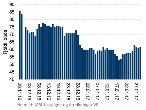 Laun ungs fólks hafa hækkað minna en annarra aldurshópa á síðustu árum. En það er ekki eini vandinn sem unga fólkið stendur frammi fyrir. Vandamálið felst einnig í því að lítið framboð er af ódýrum eignum fyrir einstaklinga sem eru að kaupa í fyrsta sinn. Mynd 3 sýnir fjölda íbúða til sölu í fjölbýli á höfuðborgarsvæðinu sem kosta undir 30 milljónum króna. Seinustu tvo mánuði hefur dregið nokkuð úr framboði. Í lok janúar 2017 voru að jafnaði 60 eignir til sölu. Meðalverð þessara 60 fasteigna er tæpar 26 milljónir og meðalstærð 55 fermetrar.