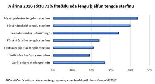 Í könnuninni fékk helmingur svarenda spurningar um fræðslumál, meðal annars hvort þeir hefðu fengið starfstengda fræðslu eða þjálfun á árinu 2016. Þrír af hverjum fjórum af þeim sem fengu fræðslutengdar spurningar höfðu sótt einhverjar fræðslu sem tengdist starfinu, t.d. fyrirlestur, ráðstefnu eða námskeið, hlustað á erindi á netinu eða fengið annars konar menntun eða þjálfun. Flestir sóttu fyrirlestur eða námskeið tengt starfinu en um þriðjungur hlustaði á fræðsluerindi á netinu. Svarendur fengu sjö valkosti í þessari spurningu og má sjá þá á myndinni. Í um helmingi tilfella var fræðslan að stærstum hluta að frumkvæði starfsmannsins en greitt af fyrirtækinu í um 70% tilfella.