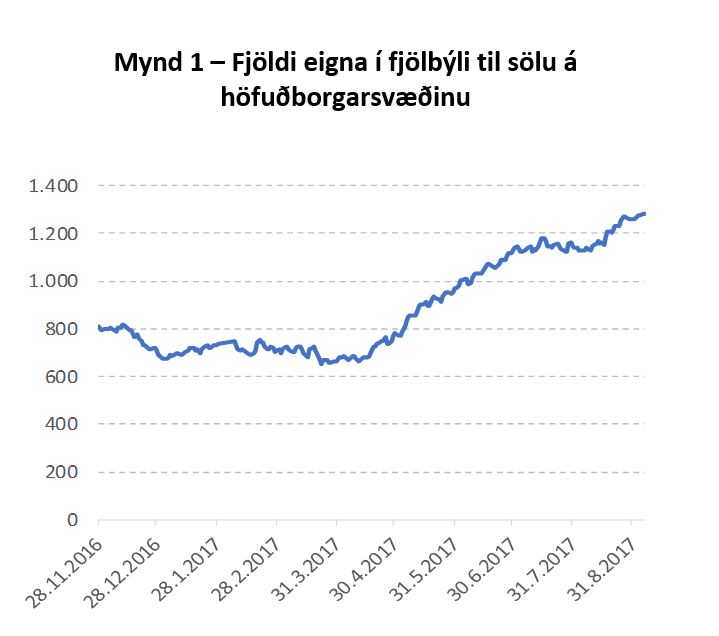 Ástæða hækkunarinnar er öllum kunn, eftirspurn hefur verið mun meiri en framboð. Í júní og júlí 2017 tók þó að hægja á hækkun fasteignaverðs, sem má meðal annars rekja til aukins framboðs. Mynd 1 sýnir fjölda eigna í fjölbýli á höfuðborgarsvæðinu sem eru til sölu á hverjum degi síðan í lok nóvember 2016. Athugið þó að fasteignaverð hefur ekki enn lækkað en hækkunin er minni en áður.
