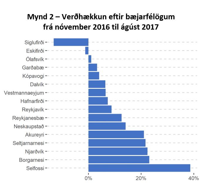 Mikil hækkun á höfuðborgarsvæðinu hefur leitt til þess að fjölmargir hafa flutt búferlum til annarra bæjarfélaga í nágrenni höfuðborgarsvæðisins. Þessi þróun birtist í hækkandi fasteignaverði viðkomandi bæjarfélaga. Mynd 2 sýnir verðhækkun í ágúst 2017 samanborið við lok nóvember 2016 og er miðað við ásett verð.